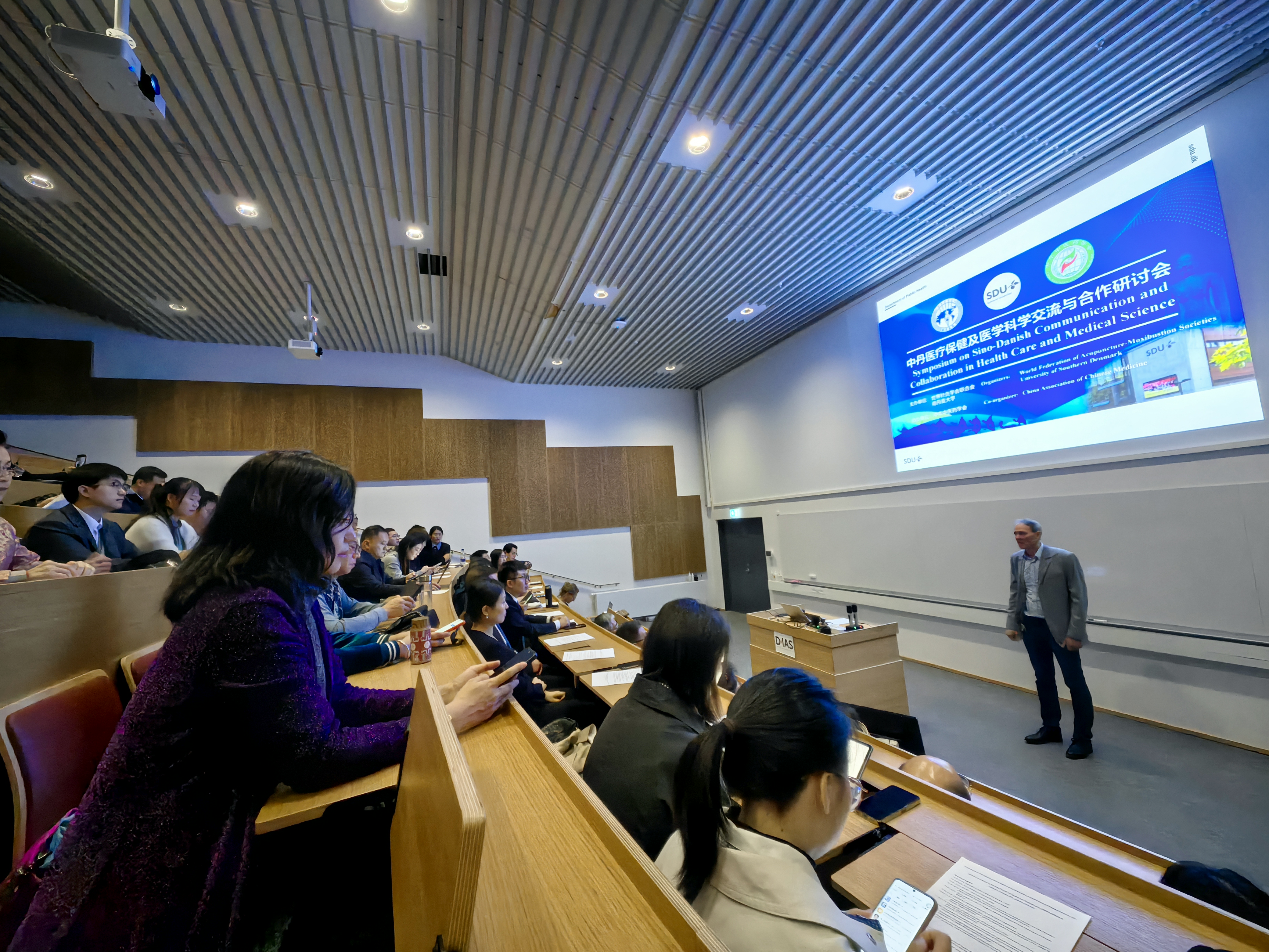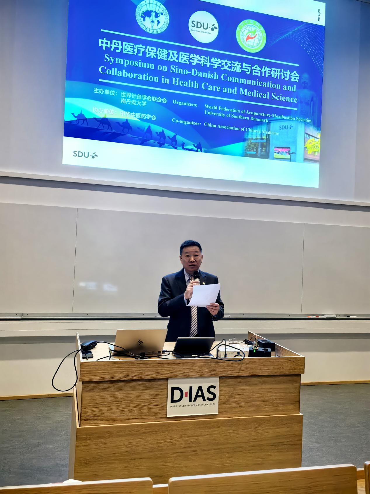 当地时间2025年9月22日,中丹医疗保健及医学科学交流与合作研讨会在位于丹麦欧登塞市的南丹麦大学举行。本次研讨会由世界针灸学会联合会、南丹麦大学共同举办,中华中医药学会协办,来自中国北京、安徽、湖南、湖北、浙江、吉林、云南、江苏、河北等多地中医药大学、医院的中医药针灸专家及南丹麦大学健康科学学院、科学学院的教授、师生等共计80余人参会。中国驻丹麦大使馆科教文处一等秘书吴晓创、三等秘书金灿,世界针灸学会联合会执委、副秘书长喻晓春,中华中医药学会秘书长李宗友,南丹麦大学健康科学学院院长奥利·斯科特(Ole Skøtt),南丹麦大学中国合作负责人杰斯帕·博·尼尔森(Jesper Bo Nielsen),南丹麦大学中国合作北京办事处执行主任欧铁等嘉宾出席研讨会。