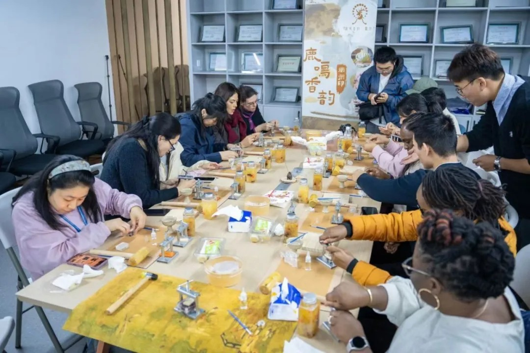 美籍青年们亲手制作桂花糕、串制非遗中药香珠,在“鹿鸣香韵·衢州印”学生创业团队的指导下,领会中医药“未病先防”的健康理念。