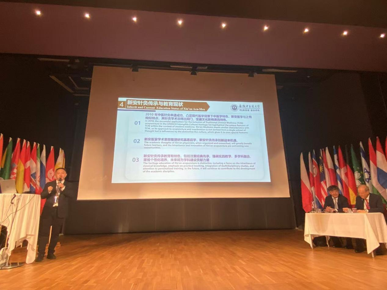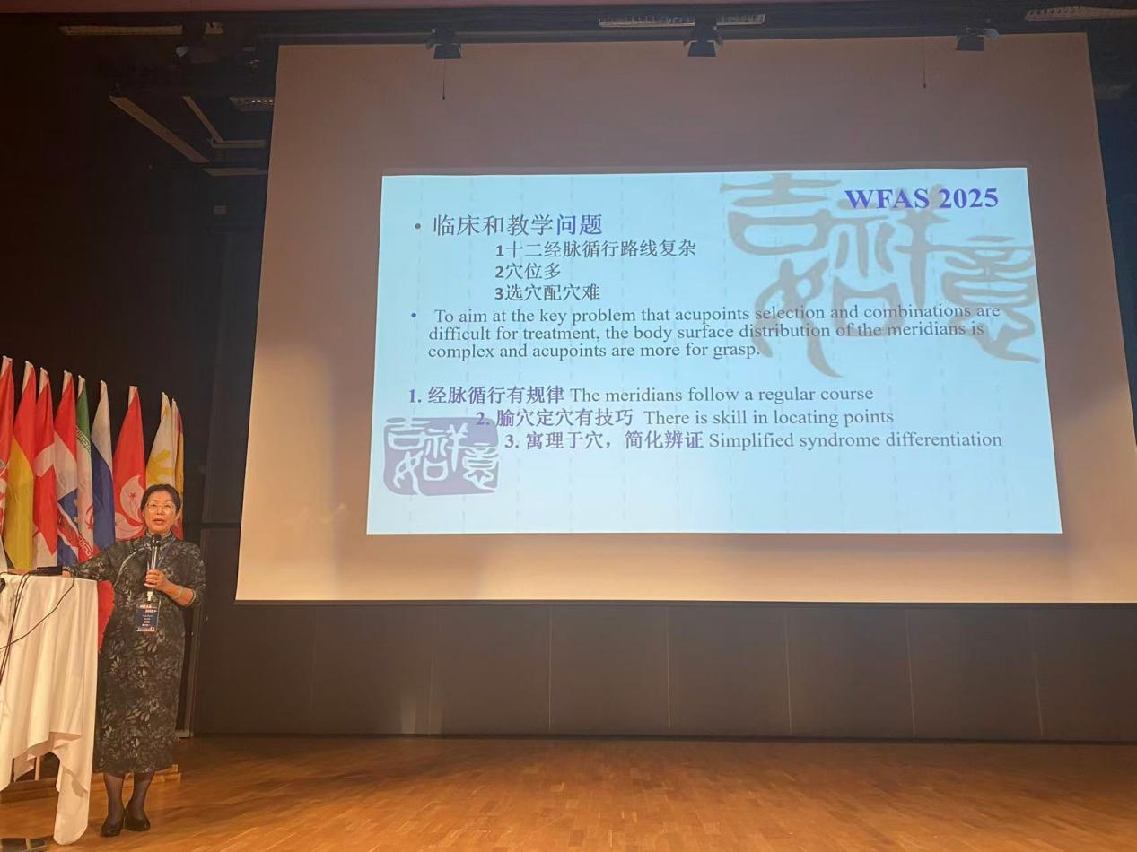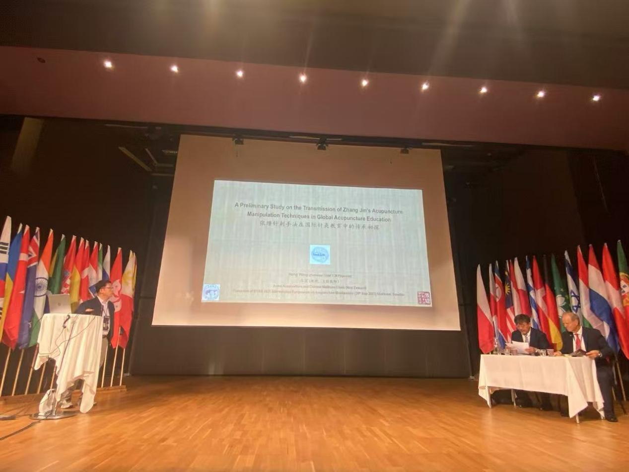 世界针灸学会联合会教育工作委员会委员王宏教授作“张缙针刺手法在国际针灸教育中的传播初探”主题报告。